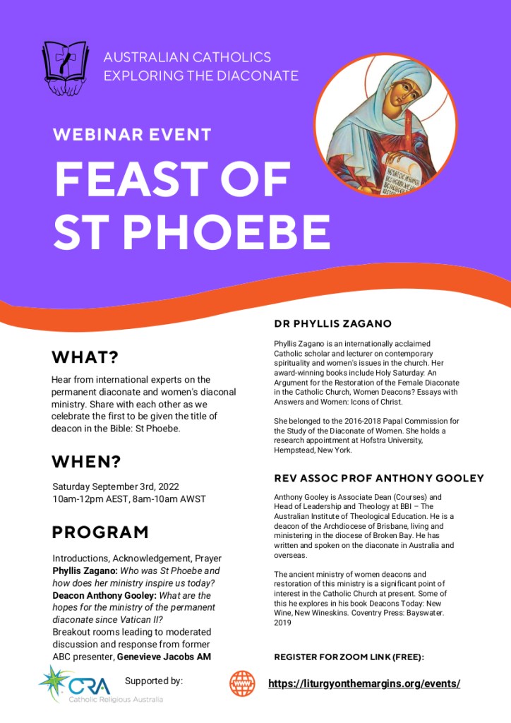 The Australian Catholics Exploring the Diaconate would like to invite you to a Webinar on the Feast of St Phoebe, Saturday 3rd September 2022, 10am-12pm AEST. We are very privileged to be hearing from international experts who will break open the topics of the permanent diaconate and women’s diaconal ministry. And we will pray along with our intercessor, St Phoebe, the first to be given the title of deacon in the Bible. The event is supported by Catholic Religious Australia.